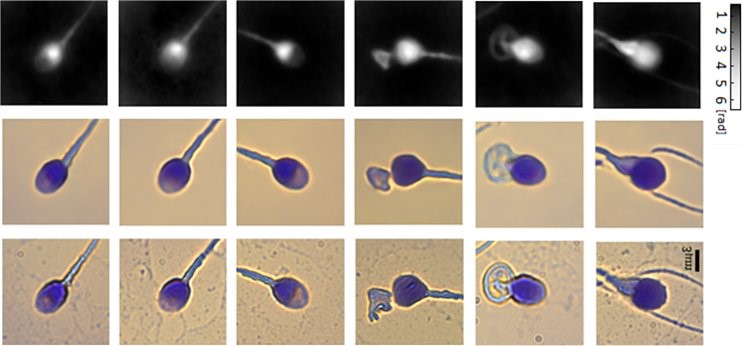שורה ראשונה - מפות טופוגרפיות כמותיות של תאי זרע שהושגו על ידי הולוגרפיה ללא צביעה.